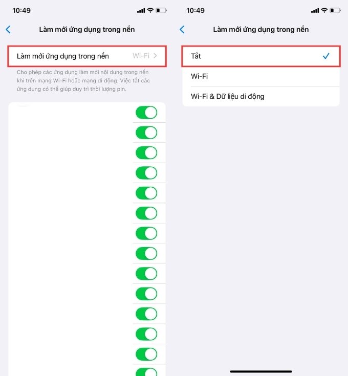 Bước 2: Tại đây, bạn tiếp tục chọn Làm mới ứng dụng trong nền > sau đó chọn Tắt để ngăn toàn bộ ứng dụng tự động cập nhật khi chạy nền.