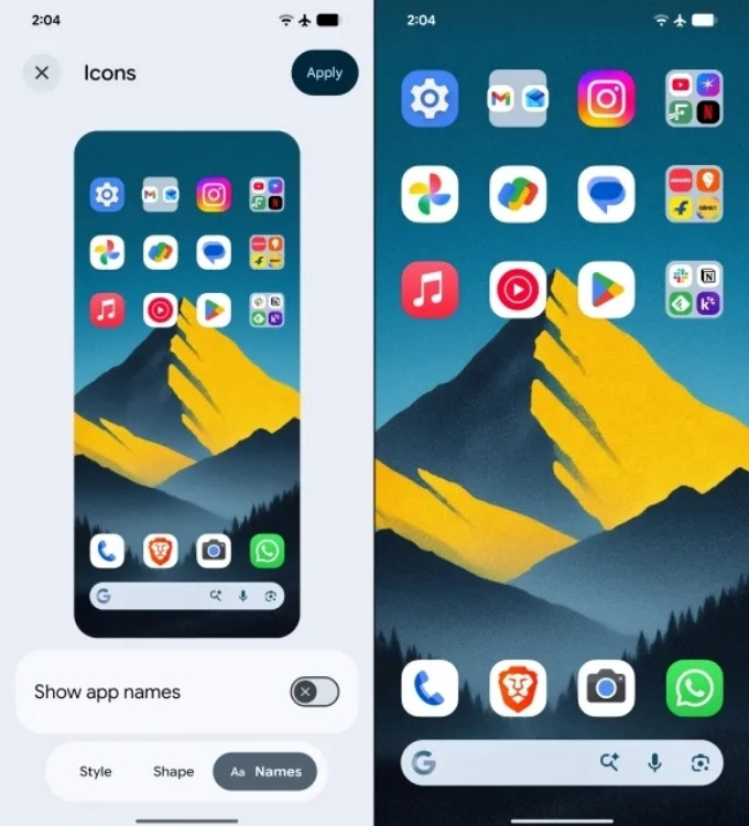 Dành cho những ai yêu thích phong cách tối giản, Android 17 cho phép bạn ẩn hoàn toàn tên các ứng dụng trên màn hình chính của Pixel Launcher. Bạn có thể tìm thấy tùy chọn này trong mục Hình nền & Phong cách. Khi kích hoạt, màn hình điện thoại sẽ chỉ hiển thị các biểu tượng ứng dụng, tạo nên một không gian làm việc sạch sẽ, tinh tế và tập trung hoàn toàn vào các biểu tượng đầy màu sắc.