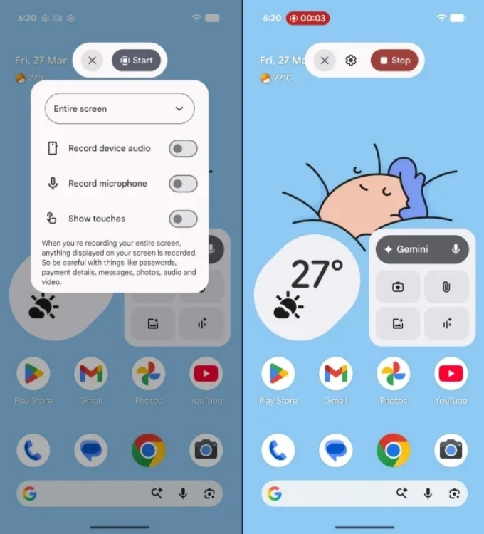 Trình quay màn hình trên Android 17 được bổ sung một thanh điều khiển dạng viên thuốc (pill overlay) vô cùng tiện lợi. Thanh này bao gồm các công cụ chú thích (vẽ, viết trực tiếp lên màn hình), bánh răng cài đặt để điều chỉnh nhanh thông số quay và nút dừng ngay lập tức. Cải tiến này giúp loại bỏ tình trạng đoạn video quay màn hình bị dính các thao tác thừa như khi bạn phải vuốt bảng thông báo xuống để dừng quay như trước đây.