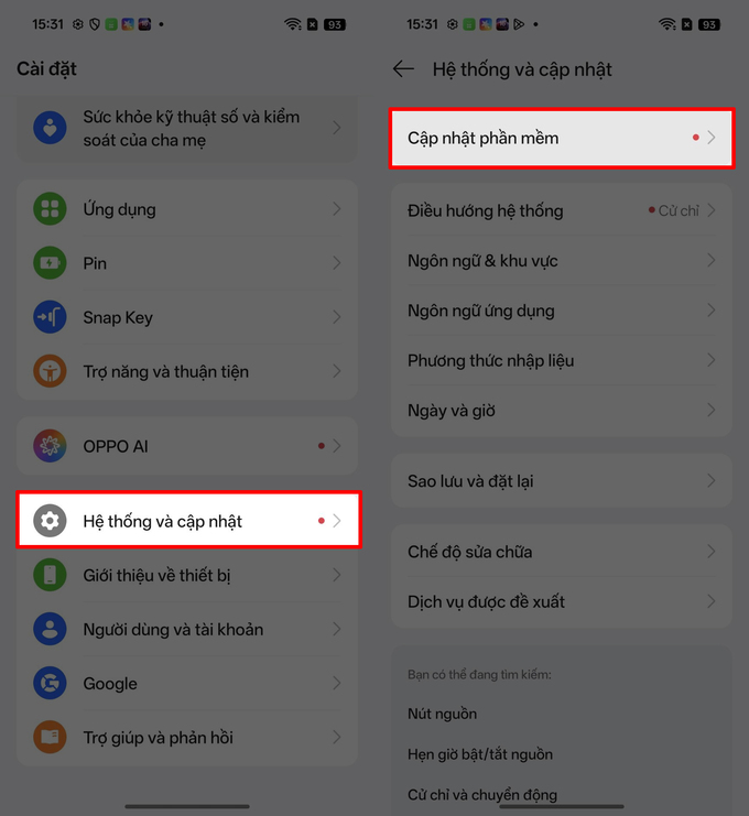 Bước 1: Trên điện thoại OPPO, vào Cài đặt > Hệ thống và cập nhật > Cập nhật phần mềm để nâng cấp lên phiên bản ColorOS 16.0.5.701 hoặc mới hơn.