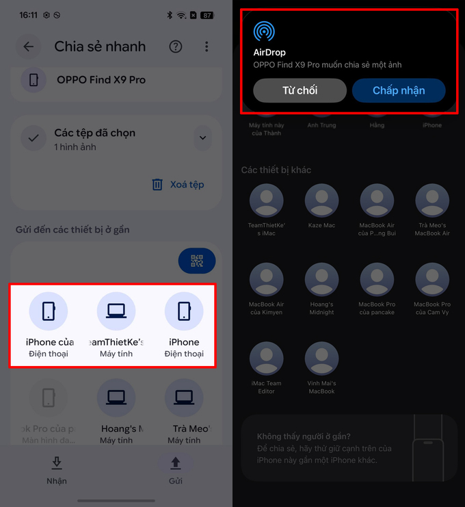 Bước 6: Khi tên iPhone hoặc MacBook xuất hiện trên màn hình OPPO, chọn đúng thiết bị > Trên iPhone hoặc MacBook, nhấn Đồng ý để nhận file.
