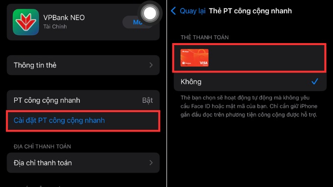 Trong danh sách các tùy chọn cài đặt, bạn tìm và nhấn vào dòng "Cài đặt PT công cộng nhanh" (Express Transit Settings). Tại đây, hệ thống sẽ liệt kê các thẻ khả dụng. Bạn chỉ cần chọn thẻ mong muốn. Lúc này, một thông báo bảo mật sẽ hiện ra yêu cầu xác thực qua Face ID, Touch ID hoặc mật mã máy để xác nhận rằng chính chủ sở hữu thiết bị đang thực hiện thay đổi này.