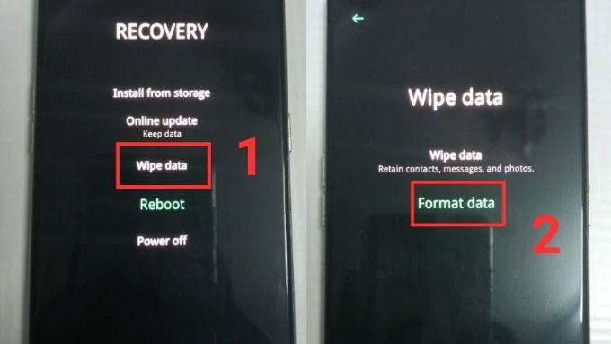 Bước 3: Dùng phím Âm lượng để di chuyển và phím Nguồn để chọn ngôn ngữ English. Sau đó, chọn Wipe data trên màn hình và tiếp tục chọn Format data.