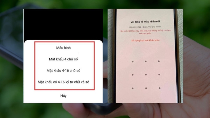Bước 2: Thiết lập mật khẩu dạng số theo mặc định hoặc chọn các phương thức khác như hình vẽ. Ví dụ, với mật khẩu hình, bạn cần vẽ mẫu một lần và sau đó xác nhận lại bằng cách vẽ lại đúng mẫu đó. Những loại mật khẩu khác cũng sẽ yêu cầu thao tác tương tự để hoàn tất cài đặt.