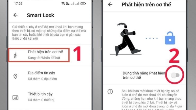 Bước 3: Tại đây, bạn có thể thiết lập các tùy chọn an toàn khác nhau. Hãy chọn từng mục và kích hoạt theo nhu cầu. Ví dụ, nếu bật “Phát hiện trên cơ thể”, điện thoại sẽ duy trì trạng thái mở khóa khi đang được cầm trên tay hoặc mang theo bên người.
