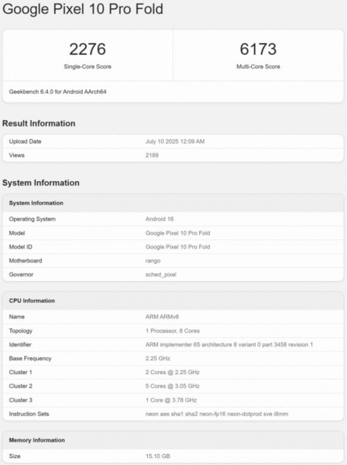 Kết quả benchmark trên Geekbench cho thấy Pixel 10 Pro Fold đạt 2.276 điểm trong bài kiểm tra đơn nhân và 6.173 điểm trong bài kiểm tra đa nhân. So với Pixel 9 Pro Fold sử dụng chip Tensor G4 (đạt 1.981 điểm đơn nhân và 4.783 điểm đa nhân), model mới cho thấy sự cải thiện đáng kể về hiệu năng. Tuy nhiên, đây chỉ là kết quả từ mẫu thử nghiệm. Các phiên bản thương mại với phần mềm và chip được tối ưu hóa có thể mang lại hiệu suất cao hơn, giúp thiết bị cạnh tranh tốt hơn trên thị trường.