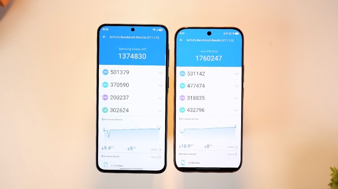 Ngược lại, Vivo V70 Elite lại phù hợp với nhóm người dùng thích cấu hình mạnh và trải nghiệm cao cấp hơn trong tầm giá. Máy vượt trội về hiệu năng với Snapdragon 8s Gen 3, điểm số benchmark cao hơn khoảng 30% so với Galaxy A57, đi kèm bộ nhớ UFS 4.1 nhanh hơn đáng kể. Bên cạnh đó, camera ZEISS với ống kính tele 3x, màn hình độ sáng cực cao và viên pin 6.500 mAh cũng giúp thiết bị nổi bật rõ rệt.