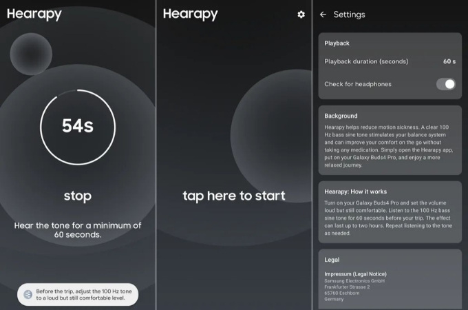 Hearapy là một ứng dụng di động hoàn toàn miễn phí được đội ngũ kỹ sư và chuyên gia tại Samsung phát triển dựa trên những nghiên cứu chuyên sâu về lĩnh vực âm thanh học và thần kinh học. Mục tiêu cốt lõi của phần mềm này là giúp người dùng giảm bớt các triệu chứng khó chịu như chóng mặt, buồn nôn và mệt mỏi phát sinh trong quá trình di chuyển bằng ô tô, tàu hỏa hoặc máy bay.
